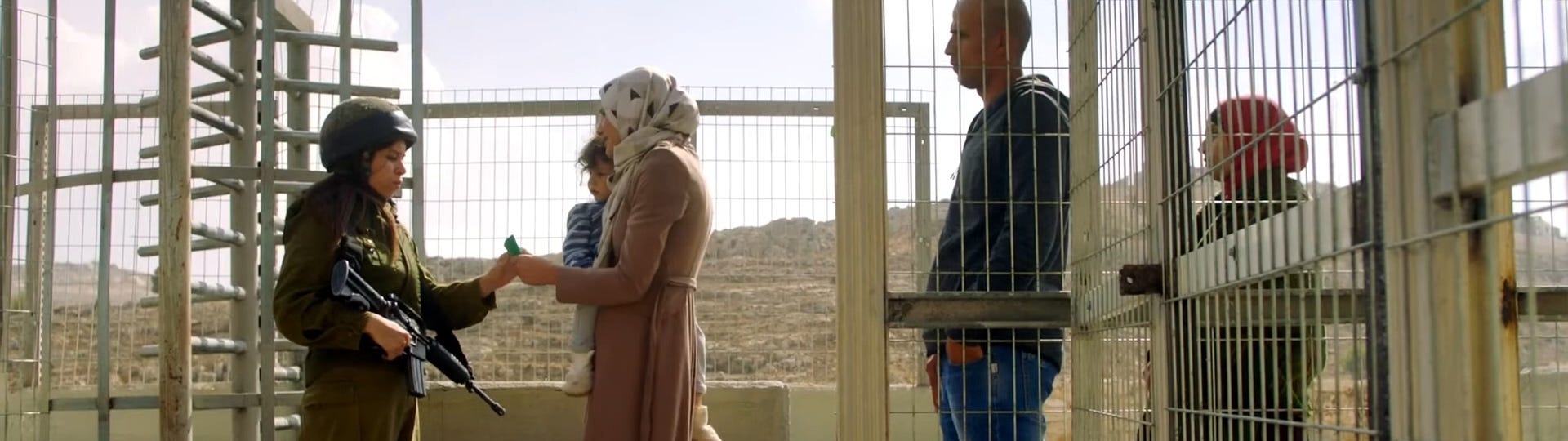 Não sabemos exatamente onde a família mora, nem pra qual cidade estão indo. Sabemos, contudo, que não há nada na Cisjordânia como uma simples caminhada: segundo o Escritório das Nações Unidas para a Coordenação de Assuntos Humanitários (OCHA, em inglês), existem 645 “obstáculos físicos” a movimentação na Cisjordânia; destes, 49 são “[…] constantemente ocupados por forças israelenses ou empresas de segurança privadas1, 139 postos de controle ocasionalmente ocupados, 304 bloqueios de estradas […]” (OCHA, 2023). Yusef (Saleh Bakri) e Yasmine encaram dois tipos de bloqueio: um dos 49 permanentemente vigiado e um bloqueio de estrada, que controla o tráfego de veículos entre os enclaves palestinos na Cisjordânia.