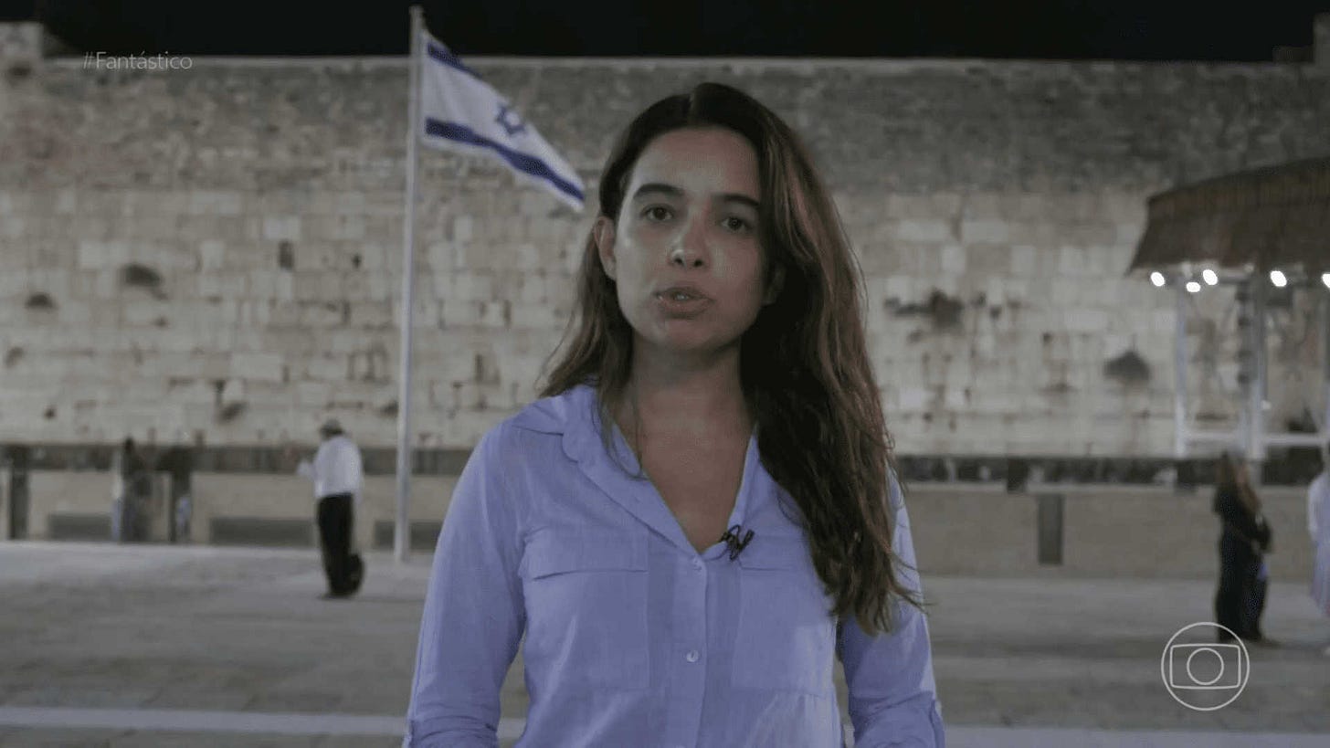 Neste sentido, é notável como as imagens da “guerra” — ou, como preferimos, do massacre — são veiculadas no Fantástico. Se é falta de rigor de apuração, formal, estético ou político, precisaríamos de mais tempo para pesquisar. Vejamos, por exemplo, como Paola de Orte, repórter especializada da Rede Globo em assuntos do Oriente Médio, aparece para contar que Jerusalém está esvaziada. Ela entrevista uma israelense, que afirma estar com medo, tal qual toda a população de Israel, e também um palestino, que enfatiza a necessidade de um acordo de paz entre seu povo e os israelenses. Antes, porém, é assim que Paola de Orte faz sua passagem: