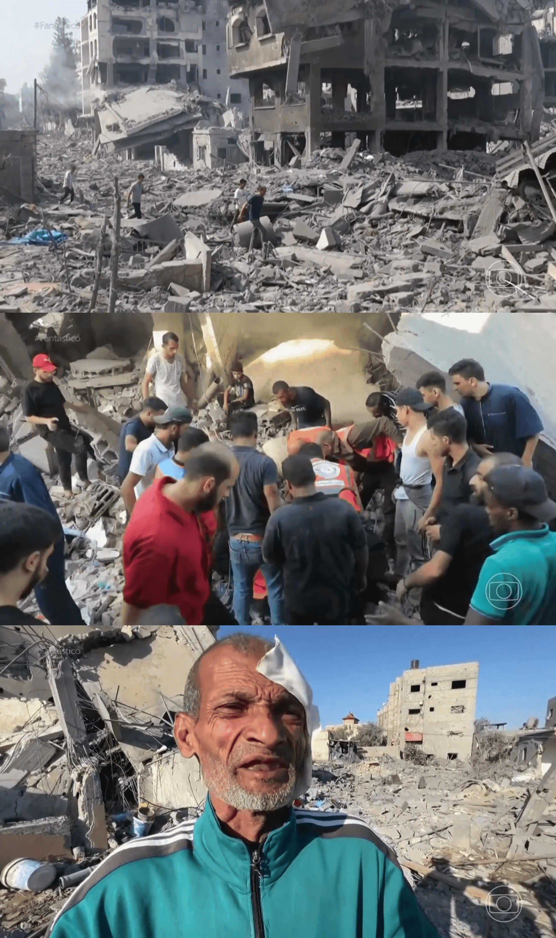 Juntando-se às fontes, e fazendo jus a sua condição de revista eletrônica, o Fantástico explora as consequências da guerra — que, conforme apontamos anteriormente, consideramos um massacre — com imagens que reforçam o que Mondzain (2022, p. 45) chama de “traços da memória colonial”: neste caso, uma memória que evoca, desde sempre, a violência, considerando a forma como se deu a fundação do Estado de Israel através da limpeza étnica de palestinos (Pappé, 2016). Não à toa, em várias das reportagens as ações organizadas do Hamas e outras de pessoas que simplesmente joguem pedras contra tanques blindados sionistas são tratadas como radicais, exemplificando exatamente o que Mondzain (2022, p. 44) considera um mau- uso do conceito da radicalidade: